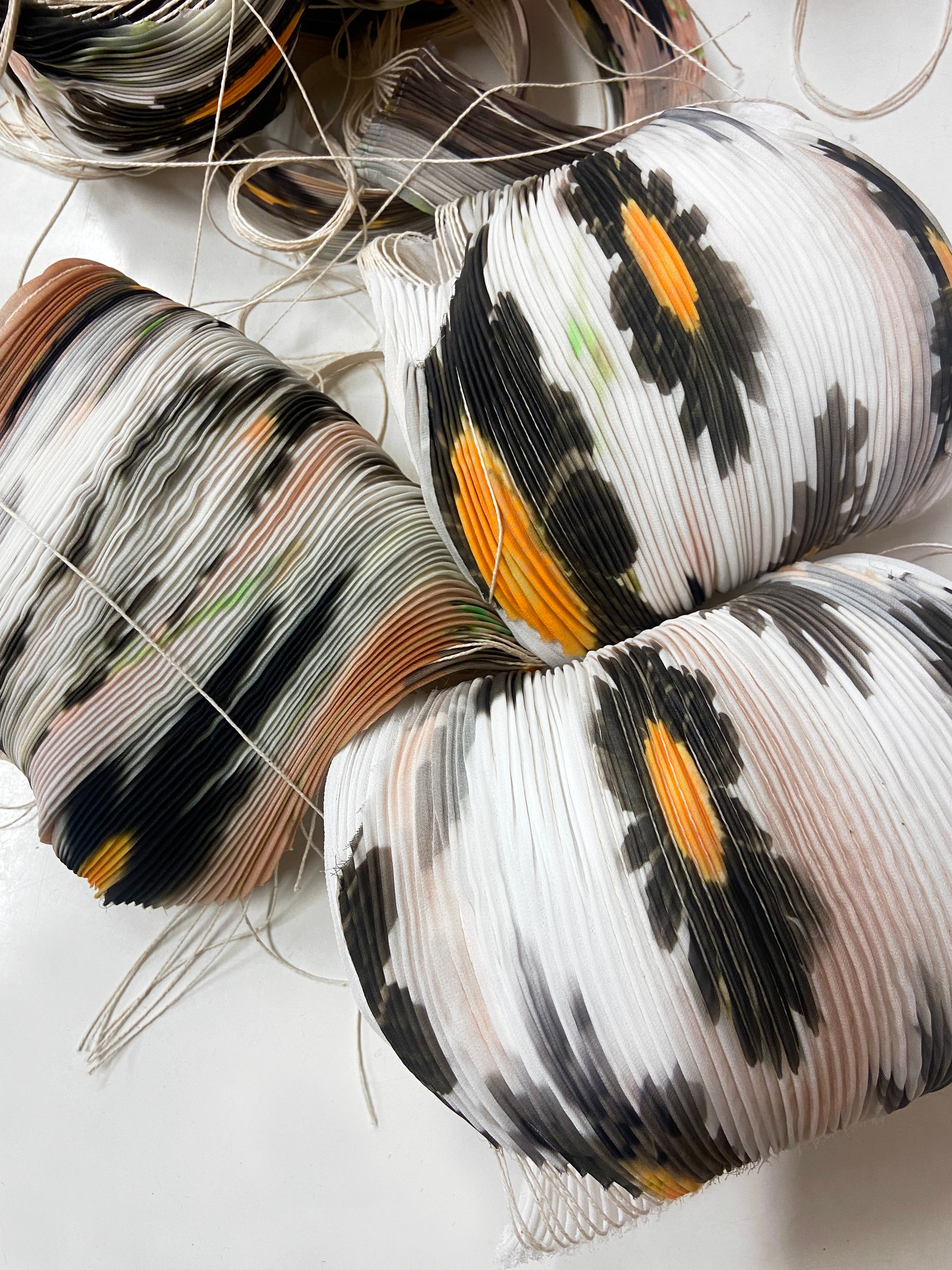 Each SHIBORI PLEAT garment reflects meticulous craftsmanship, shaped by the dedication and expertise of artisans. These skilled women, trained independently and hailing from diverse backgrounds and ages, specialize in the ancient art of Arashi Shibori, infusing each garment with their refined skills and passion.
